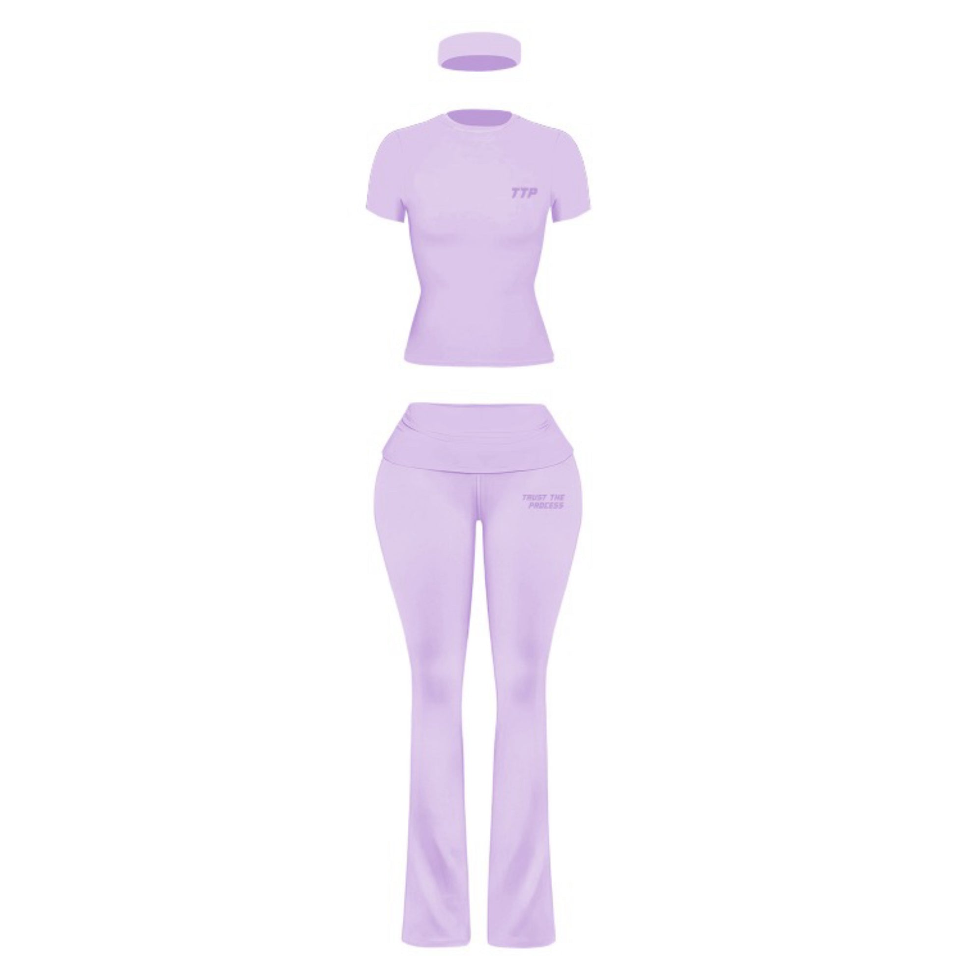 Premium athletic fabric blend. Fitted crop top with matching high-waisted bottoms. Machine washable. Soft lavender colorway.